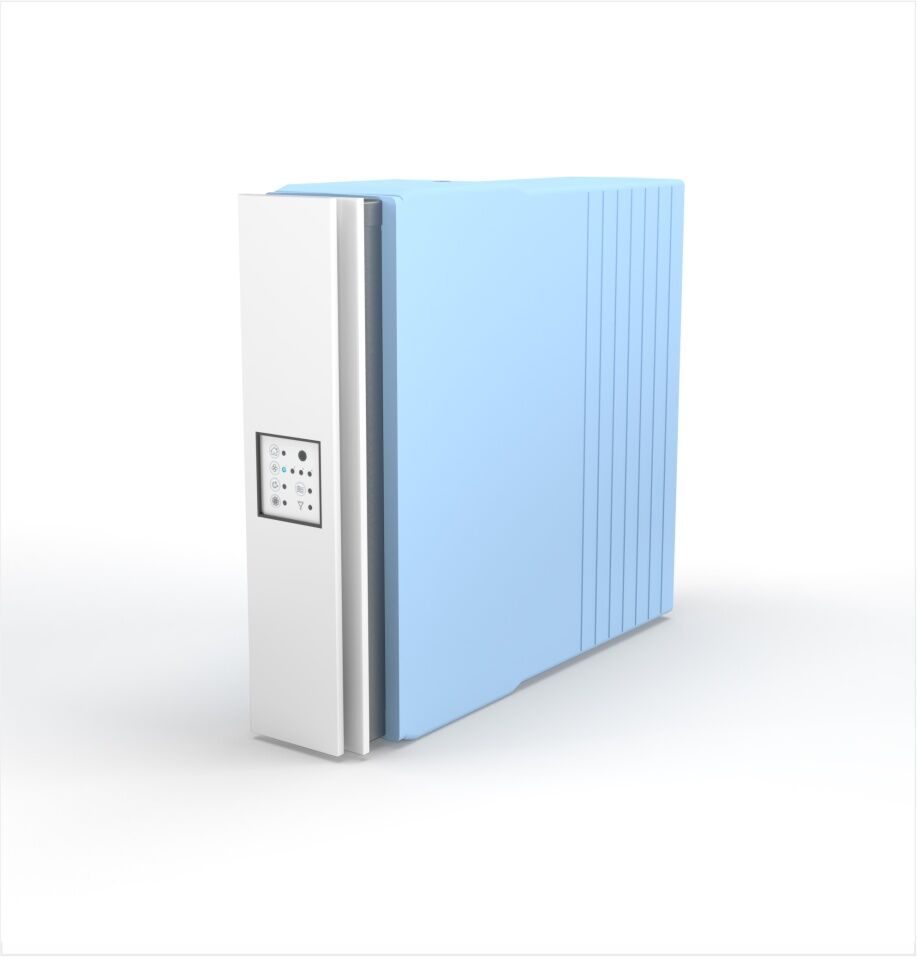 Il ne prend pas de place dans la pièce car seul le boîtier avant, en métal thermolaqué blanc ou noir ou en Plexiglas, est visible sur le mur. Dessus, un panneau de contrôle.